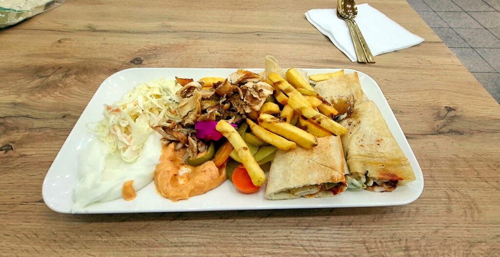 Der Teller ist reichhaltig gefüllt: ein zweigeteiltes Shawarma, Hähnchenfleisch frisch vom Drehspieß, Pommes, eingelegtes Gemüse, Weißkrautsalat und zwei Dips. Die Pommes wurden zudem mit einer braunen Soße versehen.